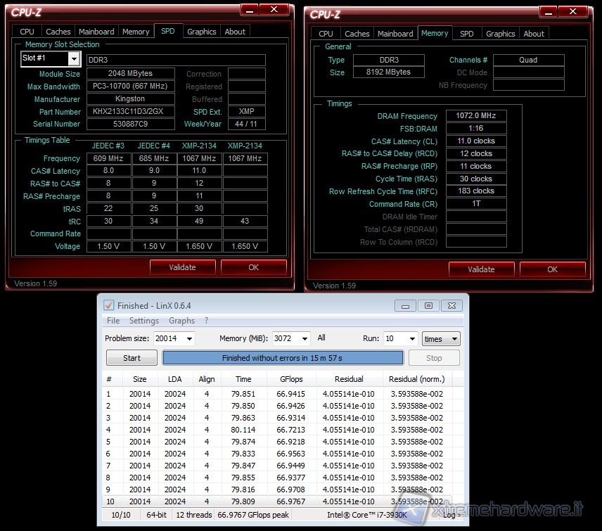 Il tool scelto per sollecitare in maniera intensiva i moduli di memoria e quindi dichiarare come stabile a lavorare alla data frequenza/timing in overclock è LinX. Basato sulle librerie Linpack, riesce a spalmare il calcolo su tutti i core della CPU (sia fisici che logici) ed a raggiungere livelli di occupazione sul processore prossimi del 100%.