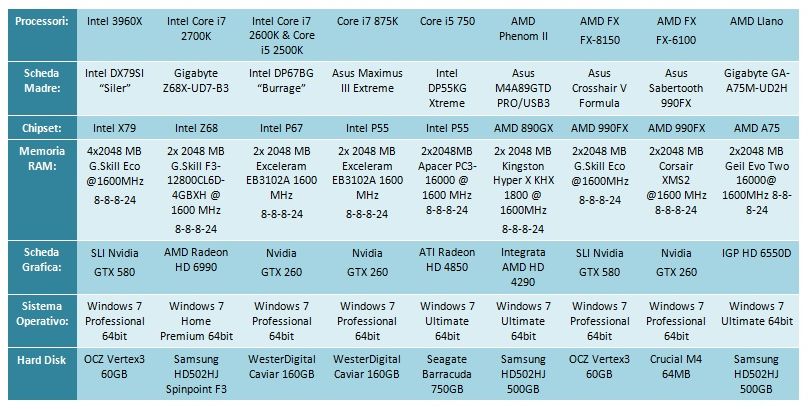 Di seguito riportiamo la tabella riportante le configurazioni con le quali abbiamo effettuato i test di questa APU.
